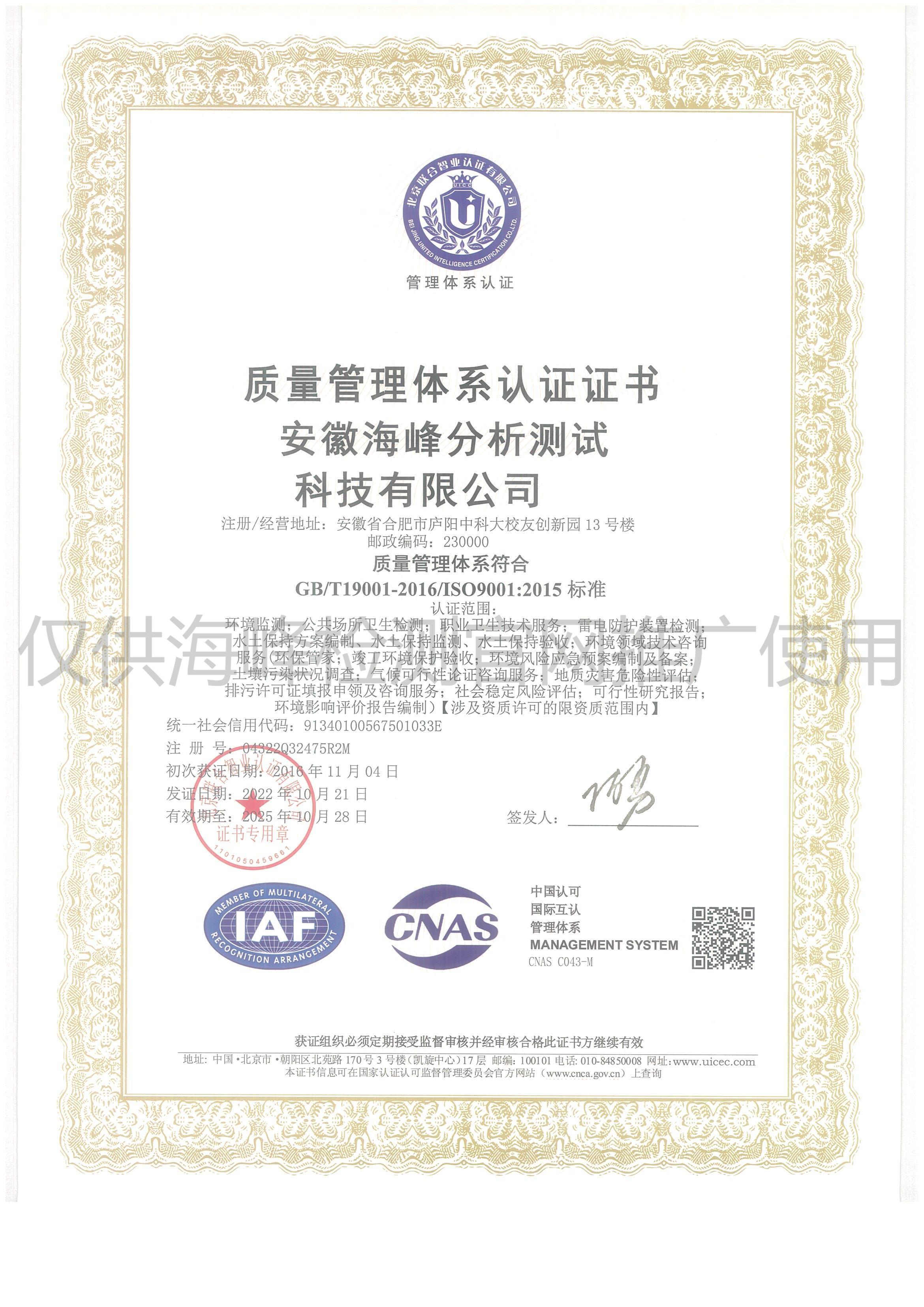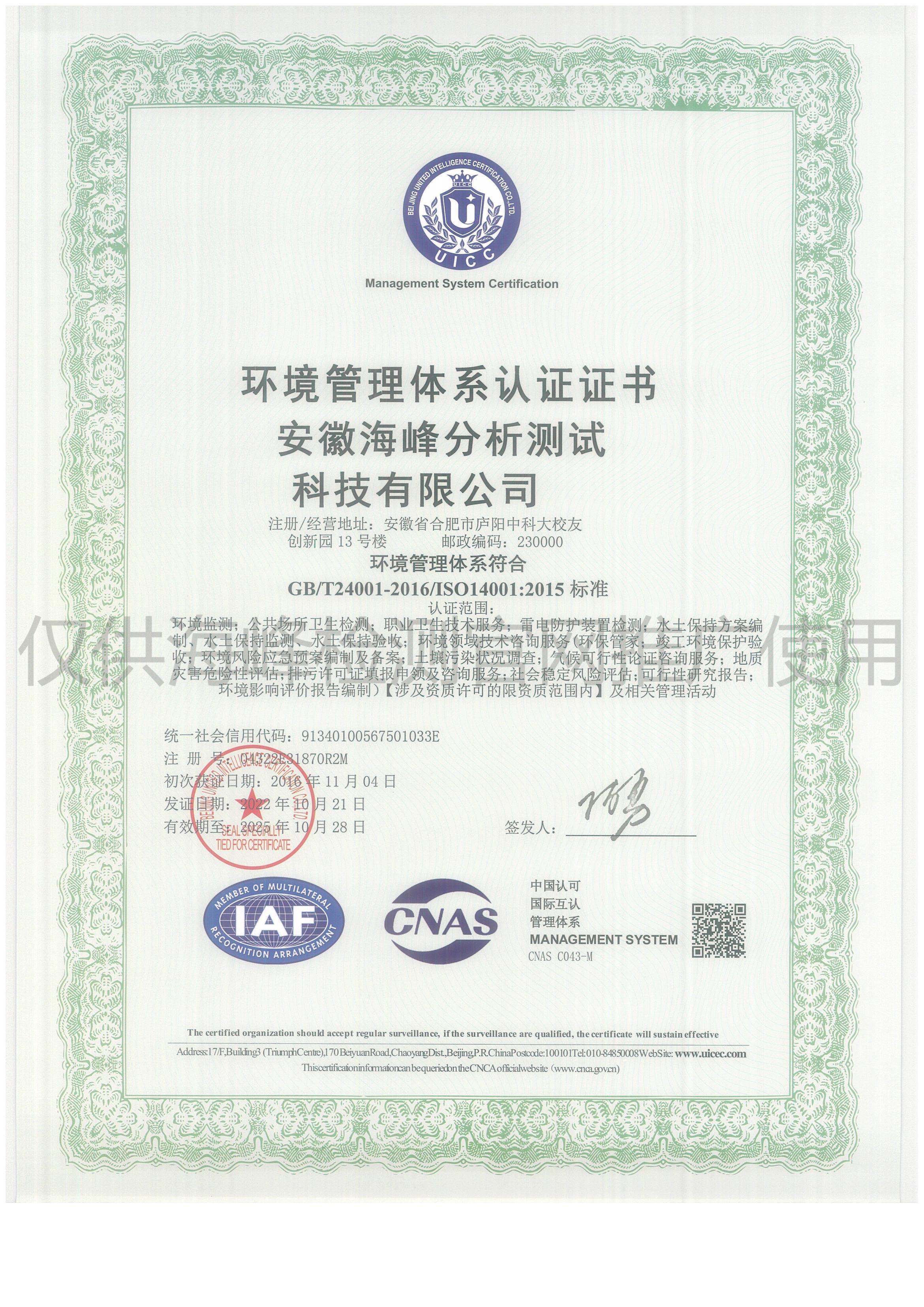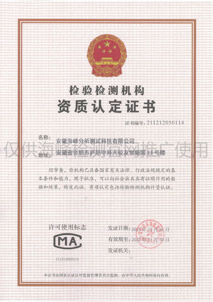 安徽海峰分析測試科技有限公司(以下簡稱海峰檢測)成立于2010 年,隸屬于安徽方中科技集團有限公司,公司下設安徽遠通檢測科技有限公司(安慶)、安徽安海新環(huán)境科技有限公司(亳州)。